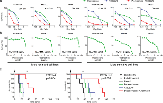 Figure 4: AS605240 shows a synergistic interaction with prednisolone. (a) MTT assay of T-ALL cell lines treated for 96 h with several ratios of the IC50 values of AS605240, prednisolone or both. Combination Index (CI) values are indicated. Synergistic effect is characterized by CI < 0.9 and additive effect by 0.9 > CI > 1.1. (b) MTT assay of T-ALL cell lines treated for 96 h with increasing concentrations of prednisolone. (c) NOD/SCID mice engrafted with primary T-ALL cells were treated with 30 mg/Kg of AS605240 and/or 5 mg/Kg of dexamethasone, intraperitoneally once a day, 5 days a week. Treatment started when human CD45+ accounted for more than 0.5% of peripheral blood cells after red blood cells lysis.