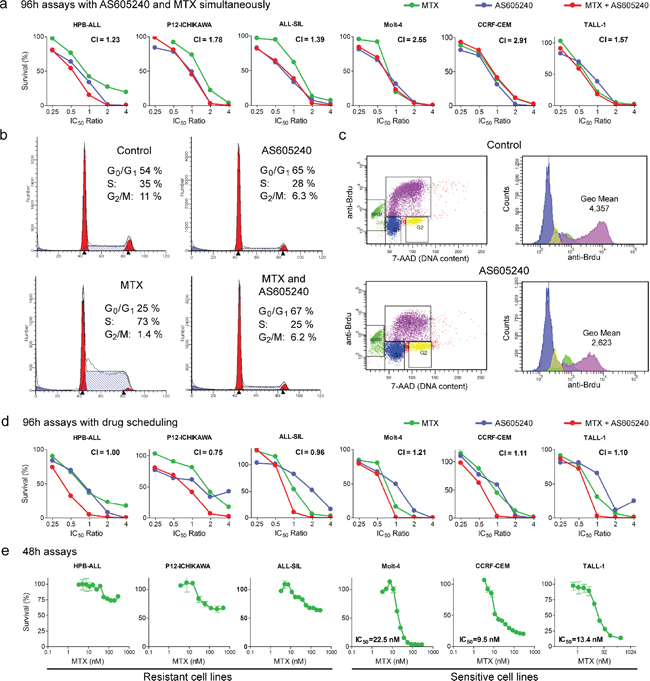 Figure 5: AS605240 showed an antagonistic interaction with MTX, which could be successfully circumvented by means of proper drug scheduling. (a) AS605240 shows an antagonistic interaction with MTX when drugs are administered concomitantly. MTT assay of T-ALL cell lines treated for 96 h with several ratios of the IC50 values of AS605240, MTX or both. Combination index (CI) values are indicated. Synergistic interaction, CI < 0.9; additive interaction, 0.9 < CI < 1.1; antagonistic interaction, CI > 1.1. (b) AS605240 reduces the percentage of cells in S and completely abrogates MTX-induced S-phase arrest. Molt-4 cells were incubated with the IC50 values of AS605240 and/or MTX for 24 h, propidium iodide stained and analyzed by flow cytometry. (c) AS605240 reduces BrdU nucleotide incorporation, as shown by reduced anti-BrdU fluorescence intensity of S-phase cells (pink) in Jurkat, P12-ICHIKAWA and Molt-4 cells. Cell lines were treated with AS605240 IC50 value for 24 h. Representative plots of P12-ICHIKAWA cells are shown. (d) AS605240 shows an additive/synergistic interaction with MTX when the PI3K inhibitor is added 48 h after those drugs (4 out of 7 cell lines tested) in a 96 h MTT assay. (e) MTT assay of T-ALL cell lines treated for 48 h with increasing concentration of MTX. IC50 values were calculated with the GraphPad Prism 5 software.