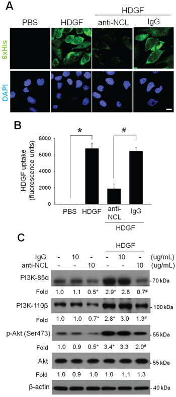 Figure 3: Effect of NCL blockade on HDGF uptake and HDGF-stimulated PI3K/Akt signaling of hepatoma cells. A. Effect of NCL blockade on HDGF uptake in SK-Hep-1 cells. After treatment with HDGF (10 ng/mL) in the absence or presence of anti-NCL neutralizing antibodies (10 μg/mL) for 4 hours, HDGF staining of cells permeabilized by Triton X-100 was detected using an anti-6xHis antibody and examined by a confocal microscope. Bar, 20 μm. B. Effect of NCL blockade on HDGF uptake in SK-Hep-1 cells. After treatment with Alexa Fluor 488 dye–labeled HDGF (100 ng/mL) in the absence or presence of anti-NCL neutralizing antibodies (10 μg/mL) for 4 hours, the amount of fluorescently-labeled HDGF was examined by a spectrofluorometer. *P < 0.05. #P < 0.05. C. Effect of NCL blockade on HDGF-stimulated PI3K/Akt signaling of SK-Hep-1 cells. After treatment with HDGF (10 ng/ml) for 24 hours, the protein levels of PI3K-85α, PI3K-110β, p-Akt and Akt were assessed by immunoblot analysis. The data are presented as the mean ± SD as percentages of the control. *P < 0.05 versus control. #P < 0.05 versus 10 ng/mL HDGF.