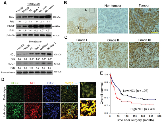Figure 4: Expression of NCL in human HCC tissues and its association with tumour grade and the survival outcome. A. NCL and HDGF expression in human hepatoma cell lines. (Upper panel) Total extracts and (Lower panel) membrane extracts were isolated for immunoblot analyses of NCL and HDGF protein levels. The data are presented as the mean ± SD as percentages of the control. *P < 0.05 versus HepG2 cells. B. NCL expression in human HCC tissues. (Left) 40 × magnification; (Middle) Non-tumour tissues. 400 × magnification. (Right) Tumour tissues. 400 × magnification. Bar, 100 μm. C. NCL expression in different grades of HCC tissues. 200 × magnification. Bar, 200 μm. D. Immunofluorescence staining of HDGF (green) and NCL (red) in the different stages of human HCC tissues. Bar, 200 μm. E. Kaplan-Meier analysis of the overall survival for HCC patients with different NCL expression levels.