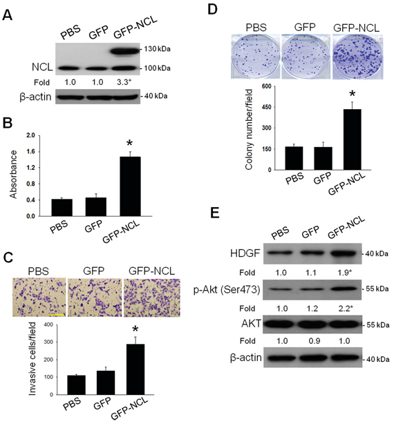 Flat colony formation assay was performed as previously described [5]. For NCL overexpression or gene silencing, the cells were harvested by trypsinization at 24 hours after transfection with NCL-GFP or NCL siRNA, and then seeded in DMEM supplemented with 0.5% FCS. The colony number was counted after fixing with paraformaldehyde and staining with crystal violet in 10% buffer formalin.
