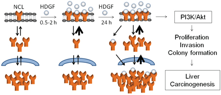 Figure 8: Hypothetical model for HDGF-induced NCL membrane trafficking from cytoplasm (in 0.5–2 hours), NCL upregulation (in 24 hours), activation of PI3K/Akt pathway and oncogenic behaviours of hepatoma cells, which ultimately contributes to liver carcinogenesis.