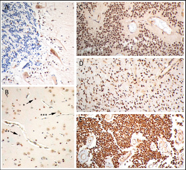 Figure 3: PARP1 immunohistochemistry on paraffin embedded sections. Representative images of PARP1 staining in (A) cerebellum, (B) cerebral cortex, with strong nuclear staining of oligodendrocytes (*) and weak nuclear staining of astrocytes (**) and neurons (***), strong nuclear staining in (C) anaplastic ependymoma, (D) anaplastic astrocytoma and (E) medulloblastoma.