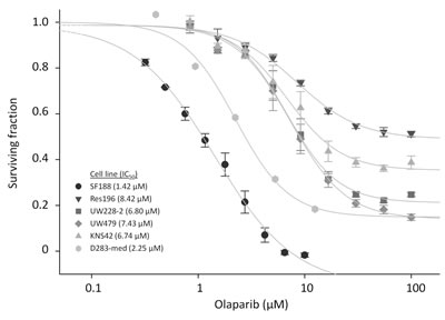 Figure 5: Cell viability assay for pediatric brain tumor cell lines, exposed to the indicated concentrations of Olaparib. Cell viability was assayed after 96 h exposure. Dots indicate mean values of experiment performed in triplicate. Bars indicate standard error of the mean (SE). IC50 values are calculated using SigmaPlot and are indicated between brackets.