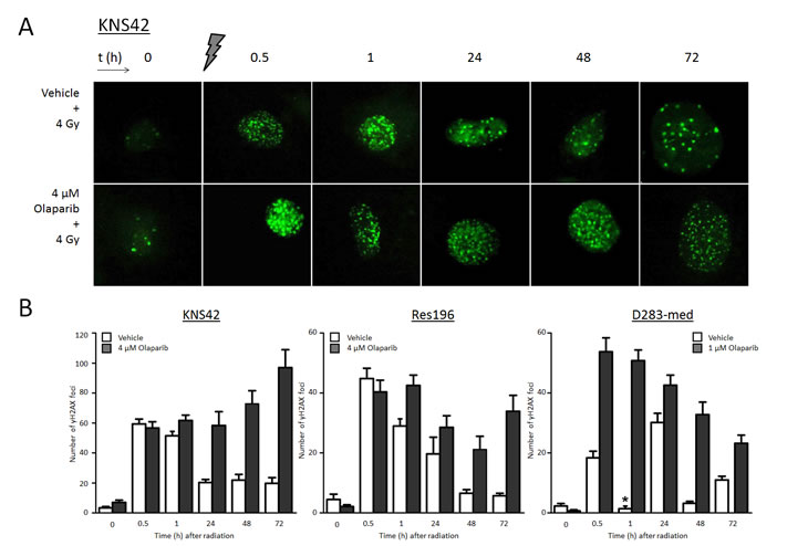 Figure 7. (A) Representative examples of immunofluorescent staining of γH2AX foci before, and (0.5 – 72 hours) after 4 Gy gamma radiation in KNS42 cells, pretreated with vehicle or 4 μM Olaparib. (B) Mean ± SE counts of γH2AX foci in KNS42, Res196 and D283-cells. D283-med cells were pretreated with 1 μM Olaparib. One hour after radiation nuclei stained diffusely positive for γH2AX in D283-med cells (*), though few foci could be detected.