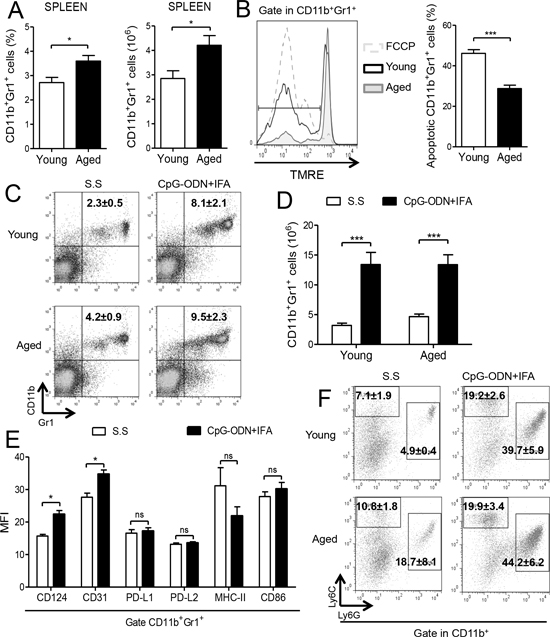 Collectively our data indicate that secondary lymphoid organs of aged mice harbor an elevated number of CD11b+Gr1+ myeloid cells which are less sensitive to spontaneous apoptosis than their younger counterparts. Besides, after CpG-ODN+IFA-treatment of aged mice, this myeloid cell population expanded and presented phenotype characteristics of MDSCs.