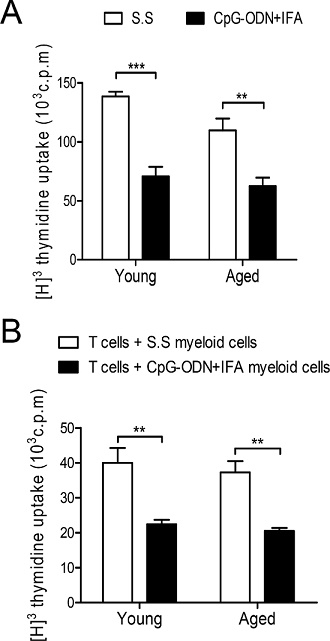 Figure 2: Myeloid cells from aged CpG-ODN+IFA-treated mice suppress T cell proliferation. Spleens were collected from young and aged mice after ten days of CpG-ODN+IFA-treatment. (A) Splenocytes were stimulated with ConA or RPMI (unstimulated) and cultured for 72 h. (B) Naïve T cells isolated from young mice were stimulated with anti-CD3 plus anti-CD28 and co-cultured, at a 1:1 ratio, with myeloid cells purified from young or aged S.S or CpG-ODN+IFA-treated mice for 48 h. (A–B) T cell proliferation was measured by [3H]-Thymidine incorporation after 18 h pulse. Values are represented as c.p.m of stimulated minus unstimulated. (A–B) Data are representative of three independent experiments; mean ± SEM (n = 4 mice/group) **p < 0.01; ***p < 0.001.