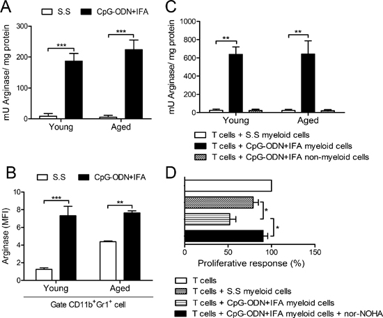These findings demonstrate that the induction of arginase is one of the major mechanisms involved in the suppressive capacity of myeloid cells from aged CpG-ODN+IFA-treated mice.