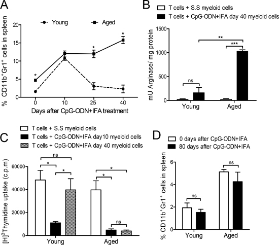 Figure 4: Myeloid suppressor cell expansion lasts longer in aged than in young mice after CpG-ODN+IFA treatment. (A) Splenocytes from young and aged mice were obtained 0, 10, 25 and 40 days after treatment, stained with anti-CD11b and anti-Gr1 and analyzed by flow cytometry. (B) Myeloid cells were isolated from young and aged mice 40 days after S.S or CpG-ODN+IFA-treatment and cultured with naïve T cells from young mice stimulated with anti-CD3 and anti-CD28. Cells were prepared for arginase activity analysis. Results are expressed as mU of enzyme activity per mg of protein lysate. (C) Ten and 40 days after treatment, myeloid cells were isolated from spleen of young and aged treated mice and cultured with naïve T-cells from young mice stimulated with anti-CD3 and anti-CD28. T-cell proliferation was measured by [3H]-Thymidine incorporation after 18 h pulse, (values are represented as c.p.m of stimulated minus unstimulated). (D) Zero or 80 days after treatment, splenocytes were removed from mice, stained with anti-CD11b and anti-Gr1 and analyzed by flow cytometry. (A–D) Results are representative of three experiments performed (mean ± SEM; n = 4 mice/group). *p < 0.05; **p < 0.01; ***p < 0.001.