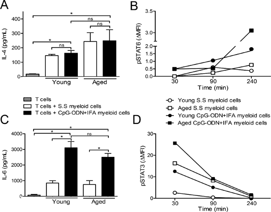 Figure 5: IL-4 and IL-6 in the extracellular medium of myeloid cells from CpG-ODN+IFA-treated mice. After 10 days of S.S or CpG-ODN+IFA-treatment, myeloid cells were isolated from the spleen of young and aged mice and cultured with naïve T cells isolated from young mice stimulated with anti-CD3 plus anti-CD28. (A and C) After 48 h of co-culture, supernatants were collected. (A) IL-4 and (C) IL-6 levels were measured by ELISA. (B and D) After 30, 90 and 240 min of co-culture, cells were collected, fixed, permeabilized, and stained with anti-CD11b, anti-Gr1, anti-STAT6(pY641) and anti-STAT3(pY705). (B) pSTAT6 and (D) pSTAT3 levels were analyzed on gated CD11b+Gr1+ myeloid cells. Results represent the expression (MFI) of pSTAT3 and pSTAT6 at 30, 90 and 240 min by subtracting that measured at zero time (ΔMFI). Data are shown from one representative experiment of (A–C) three, (B–D) two performed (mean ± SEM n = 4 mice/group) *p < 0.05.
