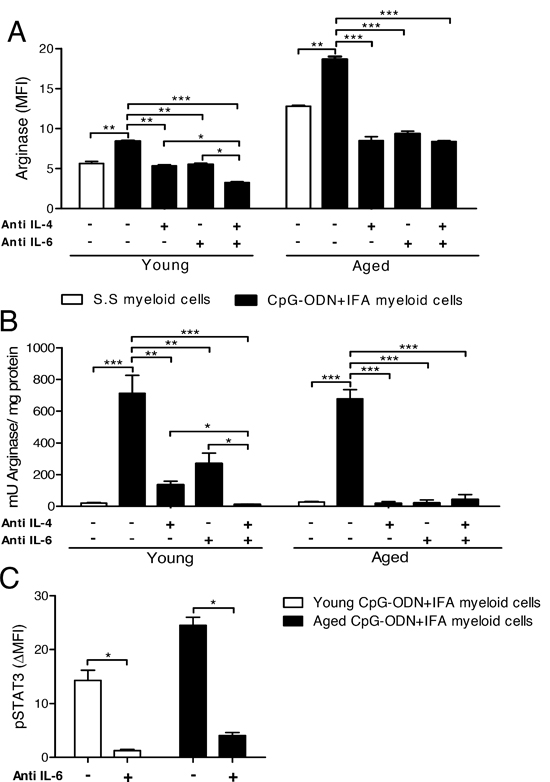Figure 6: Environmental IL-4 and IL-6 are involved in arginase induction in myeloid cells from CpG-ODN+IFA-treated mice. (A–C) After ten days of S.S or CpG-ODN+IFA-treatment, myeloid cells were isolated from the spleen of young and aged mice and co-cultured with naïve T cells isolated from young mice stimulated with anti-CD3 plus anti-CD28. Cytokine neutralizing antibodies were added separately or together. (A) After 24 h of co-culture, cells were collected and stained with anti-CD11b and anti-Gr1 antibodies, fixed, permeabilized and stained for arginase-1. Results represent the expression of arginase-1 on CD11b+Gr1+ gated cells. (B) After 48 h of co-culture, cells were lysed and prepared for arginase activity analysis. Results are expressed as mU of enzyme activity per mg of protein lysate. (C) Anti-mouse IL6 neutralizing antibody was added and, after 30 min culture, cells were collected, fixed, permeabilized, and stained with anti-CD11b, anti-Gr1, and anti-pSTAT3. pSTAT3 levels were analyzed on CD11b+Gr1+ cells. Results represent the expression of pSTAT3 (MFI) at 30 min by subtracting that measured at zero time (ΔMFI). (A–C) Data are pooled from two independent experiments (mean ± SEM; n = 3mice/group). *p < 0.05; **p < 0.01; ***p < 0.001.