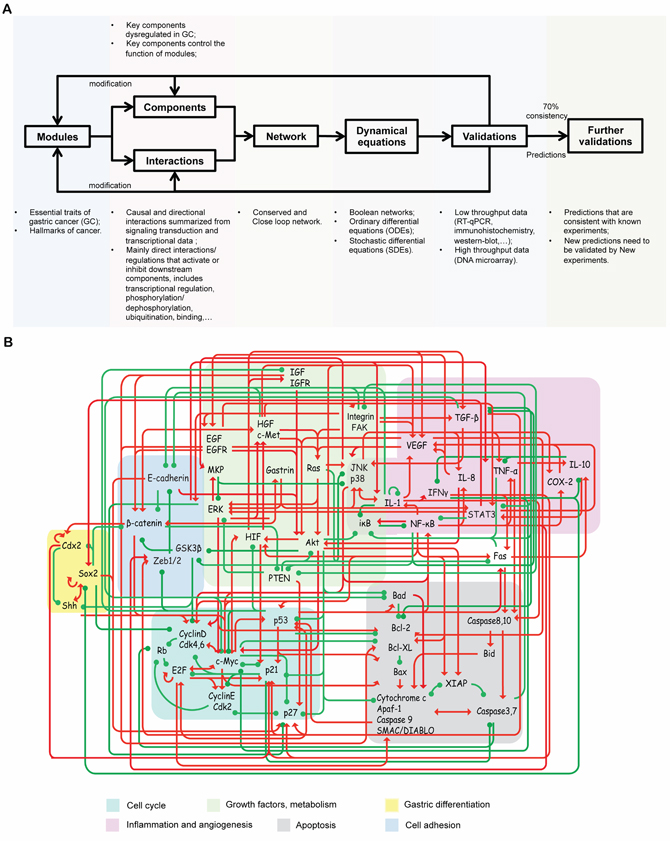 Figure 1: Work flow and the core endogenous network of GC. A. Work flow of the core endogenous network of GC construction and modeling. B. The core network included 8 functional modules, 48 functional components and 215 connections. Differently colored areas represent different functional modules. The interactions include both direct and indirect effects. The interactions can be interpreted as follows: the red arrows and green hammerheads indicate activation and inhibition processes, respectively.