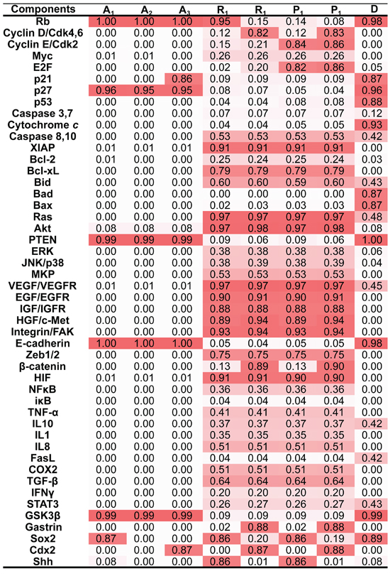 Each attractor potentially corresponded to a specific cellular phenotype with significant biological functions. Attractors are characterized by the relative activities/concentrations of components. According to the components activation or expression level of a component, the functional status (i.e., “ON” or “OFF”) of the modules in each attractor can be determined. We then summarized the status of functional modules in each attractor (Figure 3). The 8 attractors were classified into the following 4 unique cell fates based on the status of function modules: cell cycle arrest (A1–A3), proliferation (P1 and P2), cell death (D), and stress response (R1 and R2) (Figure 2). Point attractors A1–A3 with relatively high Rb and p27 activities manifested an “OFF” cell cycle and were defined as possessing a cell fate of cell cycle arrest. Cyclic attractor D with relatively high activities of pro-apoptosis factors and low activities of anti-apoptosis factors indicated that apoptosis is “ON”, and the cell fate was defined to be cell death. Point attractors R1 and R2 manifested relatively high HIF, NF-κB and inflammatory factor/receptor activities, suggesting that the stress response is “ON.” The cell fate of this class was defined as stress response. Point attractors P1 and P2 manifested relatively high cyclin E/Cdk2 and E2F activities and low Rb and p27 activities, indicating an “ON” cell cycle. The cell fate of this class was defined as proliferation. In summary, these attractors may represent specific cellular phenotypes.