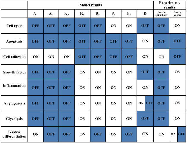 Figure 3: Functional status of modules from the model and experimental results. The functional statuses of the modules for each attractor from the endogenous network are listed in column 2—9. A1–A3: cell cycle arrest attractor; P1–P2: proliferation attractor; D: cell death attractor; R1–R2: stress response attractor. D is a cyclic attractor from which some components activities, such as VEGF/VEGFR, oscillated (Supplementary Figure 1). Thus, the functional status of angiogenesis module could oscillate between ON and OFF. The functional statuses of modules in normal gastric epithelium and GC based on experimental and clinical data are listed in column 10–11. [14, 61] N/A indicates that the functional module status is experimentally inconclusive. The clinical samples of GC show either gastric or non-gastric (mainly intestinal) phenotype at both cellular and histological level. Thus, the functional statuses of the gastric differentiation module in GC are either ON or OFF in GC.