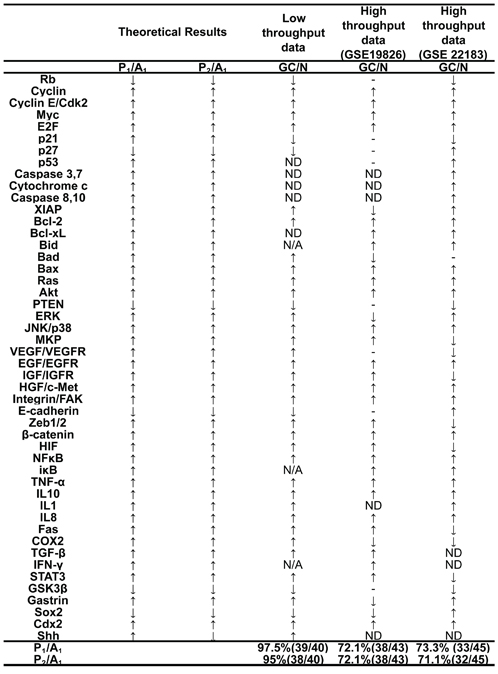 Figure 4: Comparing the modeling results and experimental data of the relative change of components. If the ratios of one component between two attractors (for example, P1 to A1) are greater than 1, we define the component activity as increased; otherwise, the component activity is decreased. Relative changes in expression or activities of components from normal gastric epithelium to GC are summarized from low and high throughput data (in column 3–5, detail references in Supporting Supplementary Table S2 and S3). The comparison indicates that 97.5% of modeling results P1/A1 are consistent with low-throughput experimental data and that 72.1% and 73.3% are consistent with high-throughput data, respectively; and for modeling results P2/A1, that 95%, 72.1% and 71.1% are consistent with low and high-throughput data, respectively. GC, gastric cancer; N, normal gastric epithelium; ↑, increased component activity or expression; ↓, decreased component activity or expression; ↓, non-significant or uncertain variation in component activity or expression; N/A, no experimental data; ND, non-determined variation in component expression.