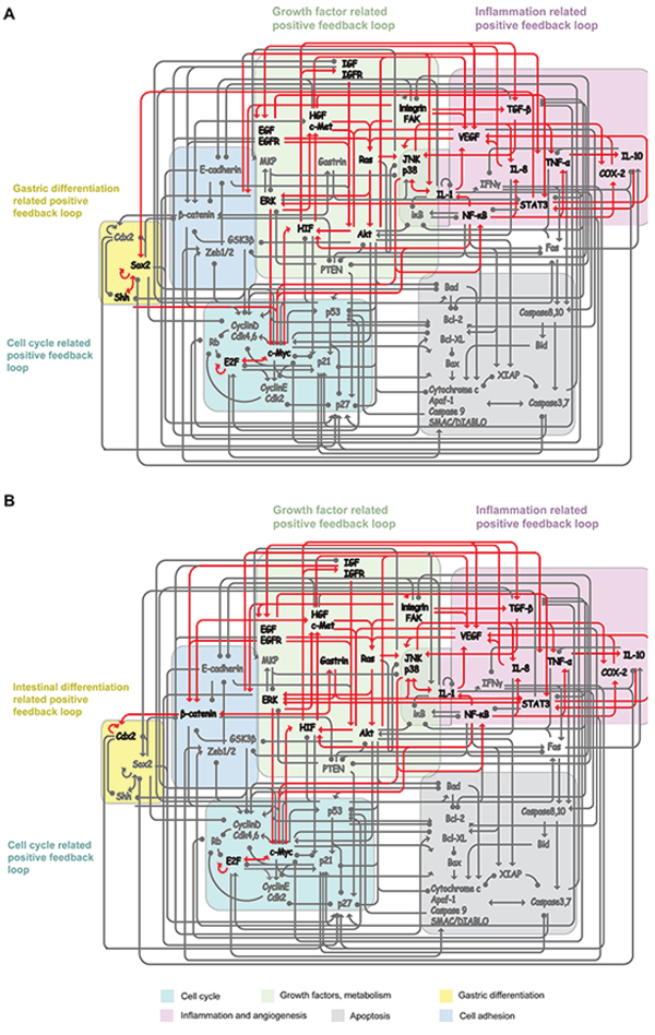 Figure 5: Positive feedback loops (PFLs) maintain heterogeneous GC cell attractors. A. Gastric type GC cell attractor is maintained by four positive feedback loops: growth factor related PFL (RTKs, Ras, Akt, MAPKs and HIF); cell cycle related PFL (Myc and E2F); inflammation related PFL (NF-κB, TNF-α, IL-1, IL-8 and IL-10)); gastric differentiation related PFL (Sox2 and Shh). B. Intestinal type GC cell attractor was maintained by growth factor related PFL, cell cycle related PFL; inflammation related PFL and intestinal differentiation related PFL (Gastrin, β-catenin and Cdx2).