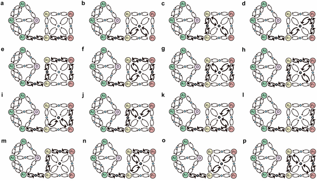 Figure 6: Inherent evolutional routes from normal gastric epithelial cell attractor A1 to GC cell attractors P1 and P2. Sixteen routes (a–p) from A1 to P1 or P2 were identified in the functional landscape of the core endogenous molecular network for gastric epithelium. Large circles represent attractors indicating 8 cellular phenotypes. Blue circles represent saddle points, which are unstable equilibrium states. Arrows denote where a transition likely occurs between 2 attractors. A1, A2 and A3, cell cycle arrest; D, cell death; R1 and R2, stress response; P1 and P2, proliferation.