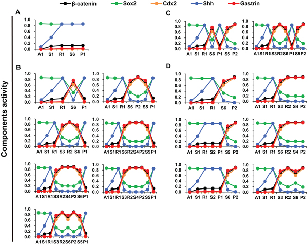 The 16 transition routes were determined by the connections of attractors and saddle points, which revealed heterogeneous activation patterns of particular components. According to the combined activation pattern of β-catenin, Cdx2, gastrin, Sox2 and Shh, the 16 transition routes could be classified into 4 definite heterogeneous routes of GC cell progression: (1) Sox2 and Shh activities are high, whereas β-catenin, Cdx2 and gastrin activities are low (Figure 7A); (2) Sox2 and Shh activities decrease and then increase, while β-catenin, Cdx2 and gastrin activities increase and then decrease (Figure 7B); (3) Sox2 and Shh activities oscillate and then decrease, whereas β-catenin, Cdx2 and gastrin activities oscillate and then increase (Figure 7C); and (4) Sox2 and Shh activities gradually decrease, whereas β-catenin, Cdx2 and gastrin activities increase (Figure 7D). The heterogeneous activation patterns resulted from the mutually inhibitory natures of the Sox2-Shh and Gastrin-Wnt/β-catenin-Cdx2 PFLs (Supplementary Figure 3). When components in the two PFL are expressed at appropriate levels, the Sox2-Shh or Gastrin-Wnt/β-catenin-Cdx2 PFL may switch on/off; then the system may tend to settle upon either gastric- or intestinal-type attractors.