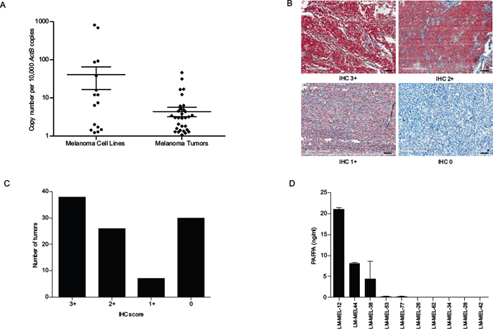 Figure 1: PAPPA expression in melanoma cell lines and tumors. A. qRT-PCR analysis of PAPPA expression in a panel of metastatic melanoma cell lines and tumors compared to ActB. B. Representative images of PAPPA expression in malignant melanoma TMAs (scale bar = 100 μm). Positive PAPPA immunostaining was graded as IHC (3+, 2+ and 1+). C. Histogram shows number of tumors scored by IHC and PAPPA positivity in melanoma TMAs. D. Conditioned media from melanoma cell lines were collected and subjected to PAPPA ELISA.