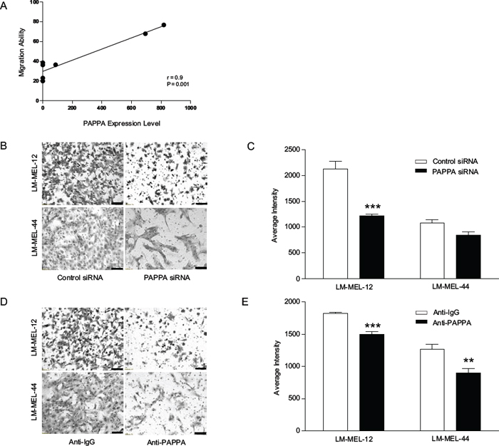 Figure 4: Ability of migration in melanoma positively correlates with PAPPA expression. A. Migratory ability of melanoma cell lines was determined by transwell migration assay. The expression and secretion of PAPPA positively correlates with migration ability of melanoma cell lines. These data represent means +/– SEM performed in triplicates. The significance (p value) and correlation co-efficient (r) were calculated by Pearson’s correlation analysis. B. Melanoma cells were transfected as described, representative images of migration in LM-MEL-12 and LM-MEL-44 are shown (scale bar = 100 μm). C. Graphs show average intensities of migrated cells after crystal violet staining calculated in K counts mm2 using Odyssey Software. D. Migratory ability of melanoma cells after treatment with control anti-IgG or anti-PAPPA antibody were tested, images captured (scale bar = 100 μm) and E. quantified as above. Values are mean +/– SEM of four independent experiments in triplicate (**p < 0.005, ***p < 0.0005).