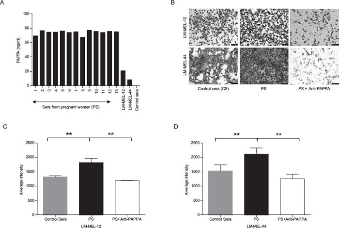 Figure 5: Pregnant serum enhances migratory capability of melanoma cell lines in vitro. A. PAPPA ELISA was performed on sera collected from healthy pregnant women, sera from non-pregnant control and conditioned media from LM-MEL-12 and LM-MEL-44. B. Melanoma cell lines LM-MEL-12 and LM-MEL-44 were incubated with the different sera or a combination of PS and anti-PAPPA antibody for 48 hours and were subjected to transwell migration assays. Representative images of migration are as shown after 24 hours (scale bar = 100 μm). The graphs show average intensities of migrated C. LM-MEL-12 and D. LM-MEL-44 cells as measured after crystal violet staining. Values are mean +/– SEM of three independent experiments in triplicate (**p < 0.005).