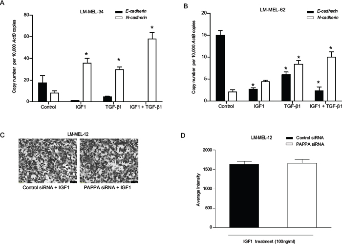 Figure 6: IGF1 induces Epithelial-to-Mesenchymal Transition (EMT) in human melanoma. Epithelial-like melanoma cells A. LM-MEL-34 and B. LM-MEL-62 were plated and incubated with or without IGF1, TGF-β1 or a combination of both IGF1 and TGF-β1 for 3 days at indicated doses. qRT–PCR analysis of EMT markers E- and N-cadherin expression was assessed. C. LM-MEL-12 was plated and treated with control or PAPPA siRNA with or without IGF1 at 100 ng/ml and transwell migration assay was performed. Representative images of migration as shown after 24 hours (scale bar = 100 μm) and D. migratory ability of melanoma cells after treatment with control or PAPPA siRNA with IGF1 was quantified as average intensity of transwell membrane. The data are representative of three independent assays carried out in triplicate (mean +/– SEM, n = 3, *p < 0.05).