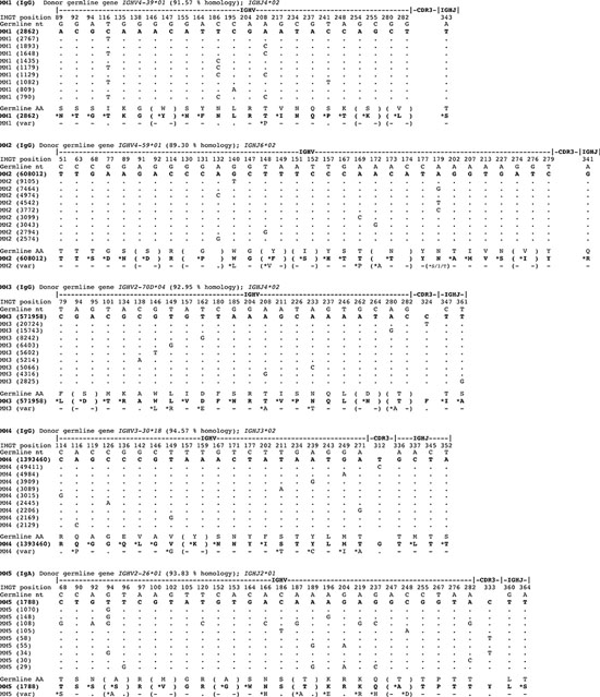 Single tumor-derived clonal IGHV sequences were readily identified in 4 of 4 MM cases with identical CDR3 nucleotide motifs to establish monoclonality, and utilized germline genes IGHV2-70D*04, IGHV3-30*18, IGHV4-39*01, and IGHV4-59*01 respectively, each displaying marked imprint of SHM with % homology to germline varying between 89.3 – 94.6 (Figure 1). In these samples, the same CDR3 sequence was found in between 74.0 – 87.3% of reads, surpassing cut-offs of >5% used to identify clonal IGHV gene use by deep sequencing [15]. Total reads from 2 replicates with identical CDR3 in respective cases were: MM1 (1,660,375); MM2 (1,232,656); MM3 (1,218,020); and MM4 (2,009,338) (Table S1). No dominant clonal IgG sequence was identifiable in control MM5 case, as expected.
