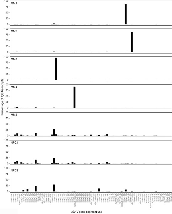 A diverse repertoire of IGHV gene use was observed in IgG transcripts in normal PCs in samples NPC1-2; however, most of these were expressed at low frequencies (data not shown). IgG transcripts were grouped by IGHV gene germline use and expression levels mapped on a linear scale based on % frequencies (Figure 2). The overall use of IGHV2-5 germline gene was the largest and common to NPC1-2 and MM5, followed by frequency of usage of the IGHV1-69 gene in these 3 samples (Figure 2). In the control IgA MM5 case, usage of germline IGHV gene elements resembled that seen in NPC1-2 (Figure 2).
