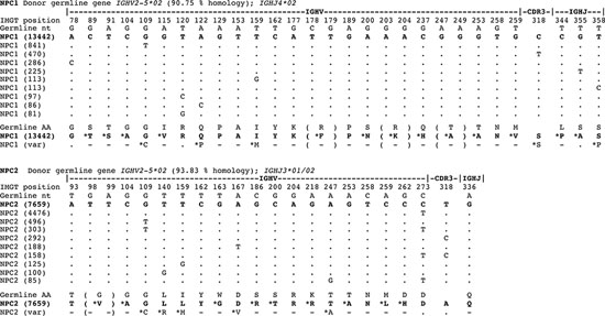 Figure 3: Oligoclonal expansions identified in IGHV gene sequences derived from normal plasma cells in the bone marrow reveal marked intraclonal variation. IgG transcript profiles obtained by deep sequencing were aligned with germline IGHV genes and CDR3 identity used to identify oligoclonal expansions in normal human plasma cells. Only informative selected codons are shown, not entire IGHV genes. The largest oligoclonal expansion in each of NPC1 and NPC2 samples are shown, indicating % homology to donor germline gene, and the top 10 clonally-related transcripts are aligned at the nucleotide level to show sequence identity to the top read (by dots) or replacement nucleotides as shown in sequences. The data reveals a significant level of intraclonal variation in oligoclonal expansions of normal plasma cells in IGHV gene sequence mutations. Translation to deduced amino acid (aa) are also shown comparing germline with plasma cell IGHV gene sequence. For both NPC1 and NPC2 aligned sequence matches start at position 65.