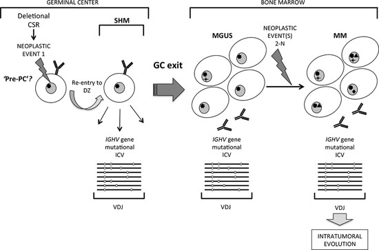 Figure 5: A distinct pathway of clonal evolution in MGUS and MM originating from a germinal center B cell undergoing somatic hypermutation. Striking intraclonal variation (ICV) in patterns of tumor-derived IGHV gene sequence mutations in MM suggest a model in which a germinal center (GC) B cell that has undergone neoplastic Event 1, possibly at the stage of deletional class-switch recombination, re-enters the GC dark zone and is subjected to on-going somatic hypermutation (SHM). It is postulated that such a cell may be a ‘pre-PC’ committed to terminal maturation but able to undergo SHM, which exits the GC to home to the bone marrow to accumulate as MGUS. Subsequent sum of neoplastic Events 2-N in MGUS cells generate malignant MM, which retain the imprint of ICV resulting from the GC cell of origin being exposed to on-going SHM in tumor-derived IGHV genes.