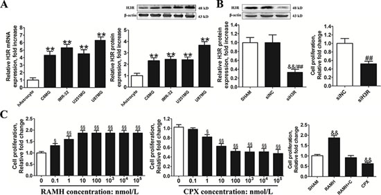 Figure 2: Inhibition of the H3R expression by siRNA or an antagonist decreased the proliferation of U87MG cells. A. Group results of H3R expression from the RT-qPCR and western blot in the glioma cells and the human astrocytes. B. The effects of H3R siRNA on the proliferation of U87MG cells. The specific siRNA for H3R significantly decreased H3R protein expression in U87MG cells and cell proliferation in U87MG cells. C. The effects of H3R agonist/antagonist on the cell proliferation of U87MG cells. U87MG cells were incubated with H3R agonist/antagonist and cell proliferation was measured. The effects of 100 nmol/L RAMH on the proliferation of the U87MG cells were completely blocked by 100 nmol/L CPX. Bars represent as mean ± SD. **P < 0.01 vs. hAstrocyte; &&P < 0.01 vs. SHAM; ##P < 0.01 vs. siNC; §P < 0.05 vs. 0; §§P < 0.01 vs. 0; n = 8 for each group.