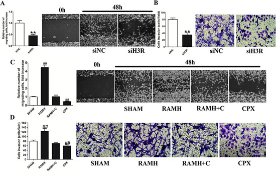 Figure 3: Inhibition of the H3R by the siRNA or CPX decreased the metastatic and invasive ability of U87MG cells. A and B. Group results from the wound healing migration assay and transwell invasion assay after down-regulation of H3R by siRNA. H3R down-regulation by siRNA inhibited cell migration and invasion of U87MG cells. C and D. Group results from the wound healing migration assay and transwell invasion assay after pretreatment with H3R agonist RAMH or/and antagonist CPX. H3R blockade by antagonist inhibited cell migration and invasion of U87MG cells. Bars represent as mean ± SD. **P < 0.01 vs. siNC; ##P < 0.01 vs. SHAM; n = 8 for each group.