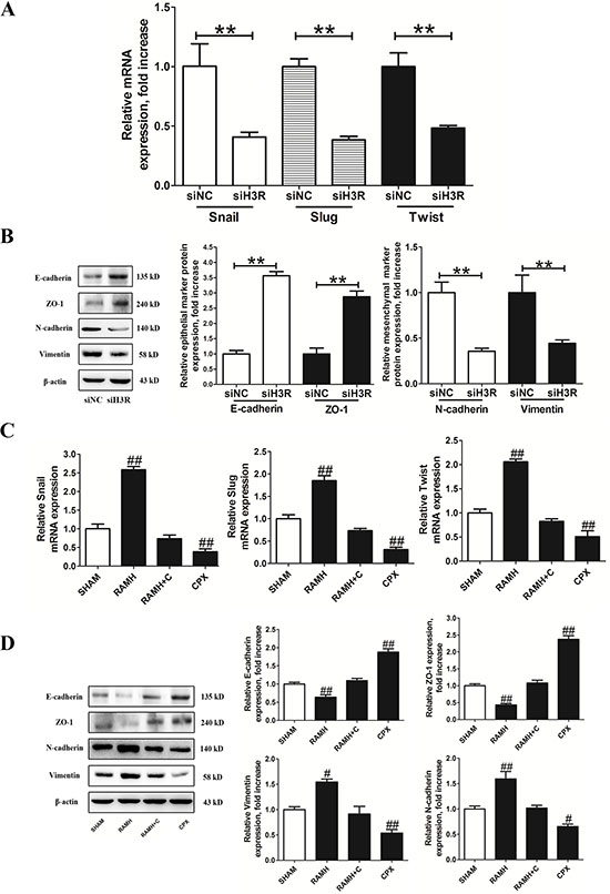 Figure 4: Inhibition of the H3R by the siRNA or CPX suppressed EMT progression in U87MG cells. A and B. Group results from the RT-qPCR and western blots after down-regulation of H3R expression using the siRNA. H3R down-regulation by the siRNA decreased EMT activators mRNA, increased epithelial markers (E-cadherin and ZO-1) and decreased mesenchymal markers (N-cadherin and vimentin) in U87MG cells. C and D. Group results from the RT-qPCR and western blot after pretreatment with the H3R agonist RAMH or/and the antagonist CPX. Blockade of H3R by CPX decreased EMT activators mRNA, increased epithelial marker (E-cadherin and ZO-1) and decreased mesenchymal marker (N-cadherin and vimentin) in U87MG cells. Bars represent as mean ± SD. **P < 0.01 vs. siNC; #P < 0.05 vs. SHAM; ##P < 0.01 vs. SHAM; n = 8 for each group.
