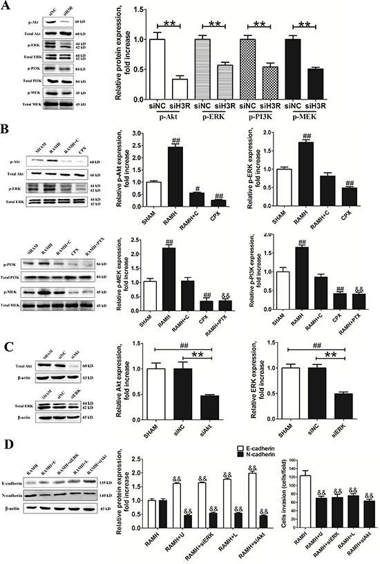 Figure 5: Inhibition of Akt/ERK by the siRNA or CPX suppressed RAMH-induced cell invasion or reorganization of the cadherin-household. A and B. Representative immunoblots of samples from U87MG cell lysates subjected to different treatments and their quantitative densitometric analysis. Inhibition of H3R by the siRNA or CPX suppressed the activation of PI3K/Akt and MEK/ERK signaling pathways. C and D. Group results from western blot after application of Akt2/ERK1 siRNAs and antagonists. Applicantion of Akt2/ERK1 siRNAs significantly inhibited the Akt/ERK expression in the U87MG cells. Inhibition of Akt/ERK by siRNA or antagonist suppressed RAMH-induced cell invasion and reorganization of the cadherin-household; Bars represent as mean ± SD. **P < 0.01 vs. siNC; #P < 0.01 vs. SHAM; ##P < 0.01 vs. SHAM; &&P < 0.01 vs. RAMH; n = 8 for each group.