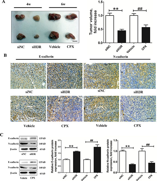 Figure 6: Inhibition of the H3R by the siRNA or CPX restrains the growth and EMT progression in a xenografted model. A. Group representative images of xenograft tumors and quantitative tumor volume analysis after treatment; B. Group representative pictures of immunohistochemical labeling for the epithelial and mesenchymal phenotype markers in the harvested tumor tissues (bar = 100 μm). C. Western blot assay for the expression of the epithelial and mesenchymal phenotype markers in the harvested tumor tissues and their quantitative densitometric analysis. Bars represent as mean ± SD. **P < 0.01 vs. siNC; ##P < 0.01 vs. SHAM; n = 8 for each group.