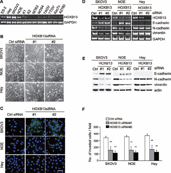 Figure 1: Depletion of HOXB13 induces reversion of EMT. A. Expression of HOXB13 in ovarian cancer cell lines was examined using RT-PCR. B. Cells were transfected with siRNAs, and pictures were taken after 72 h to visualize the cellular morphology (Scale bar = 100 μm). C. Cells cultured on glass coverslips were transfected with siRNAs; 72 h later, cells were immunostained with anti-E-cadherin antibody and DAPI. Pictures were taken using a confocal fluorescence microscope (Green: E-cadherin, Blue: DAPI, Scale bar = 50 μm). D. Total RNA was extracted from siRNA-transfected cells, and the mRNA expression levels of the indicated genes were determined using RT-PCR. E. Following siRNA transfection, the expression of the indicated proteins was examined using immunoblotting. F. Cells were transfected with siRNA and then subjected to the in vitro invasion assay 72 h later. The graph indicates the average number of invaded cells per field. Three independent experiments were performed, and the data are shown as the mean ± SD (**P < 0.01).