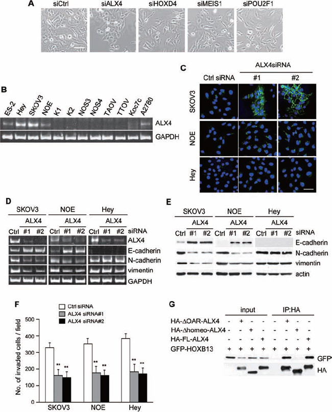 Figure 2: Depletion of ALX4 induces reversion of EMT. A. Cells were transfected with siRNAs, and pictures were taken after 72 h to visualize the cellular morphology (Scale bar = 100 μm). B. Expression of ALX4 in ovarian cancer cell lines was examined using RT-PCR. C. Cells cultured on the glass coverslips were transfected with siRNAs; 72 h later, cells were immunostained with anti-E-cadherin antibody and DAPI. Pictures were taken using a confocal fluorescence microscope (Green: E-cadherin, Blue: DAPI, Scale bar = 50 μm). D. Total RNA was extracted from siRNA-transfected cells, and the mRNA expression levels of the indicated genes were determined using RT-PCR. E. Following siRNA transfection, the expression of the indicated proteins was examined using immunoblotting. F. Cells were transfected with siRNA and then subjected to the in vitro invasion assay 72 h later. The graph indicates the average number of invaded cells per field. Three independent experiments were performed, and the data are shown as the mean ± SD (**P < 0.01). G. The indicated combinations of proteins were transiently expressed in 293T cells and immunoprecipitated with anti-HA antibody. The immunoprecipitates were immunoblotted with anti-HA or anti-GFP antibody.