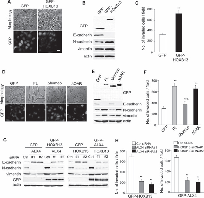 Figure 3: Exogenous expression of HOXB13 and ALX4 promote EMT. A. SKOV3 cells that constitutively expressed GFP or GFP-HOXB13 were established by retrovirus infection (Scale bar = 20 μm). B. The expression of the indicated proteins was examined using immunoblotting. C. The graph indicates the average number of invaded cells per field. Three independent experiments were performed, and the data are shown as the mean ± SD (**P < 0.01). D. SKOV3 cells that constitutively expressed the indicated proteins were generated by retrovirus infection (Scale bar = 20 μm). E. The expression of the indicated proteins was examined using immunoblotting. F. The graph indicates the average number of invaded cells per field. Three independent experiments were performed, and the data are shown as the mean ± SD (**P < 0.01). G. GFP, GFP-HOXB13 and GFP-ALX4 SKOV3 cells were transfected with the indicated siRNAs; 72 h later, the expression of the indicated proteins was examined using immunoblotting. H. The graph indicates the average number of invaded cells per field. Three independent experiments were performed, and the data are shown as the mean ± SD (**P < 0.01).