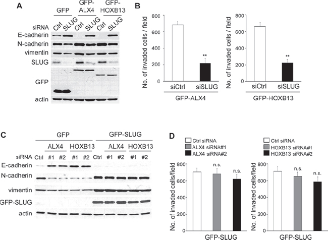 Figure 5: SLUG expression is critical for ALX4- and HOXB13-mediated EMT and cell invasion. A. GFP-HOXB13 or GFP-ALX4 SKOV3 cells were transfected with SLUG siRNA; 72 h later, the expression of the indicated proteins was determined using immunoblotting. B. The graph indicates the average number of invaded cells per field. Three independent experiments were performed, and the data are shown as the mean ± SD (**P < 0.01). C. GFP-SLUG SKOV3 cells were transfected with siRNAs; 72 h later, the expression of the indicated proteins was determined using immunoblotting. D. The graph indicates the average number of invaded cells per field. Three independent experiments were performed, and the data are shown as the mean ± SD (n.s., not significant).