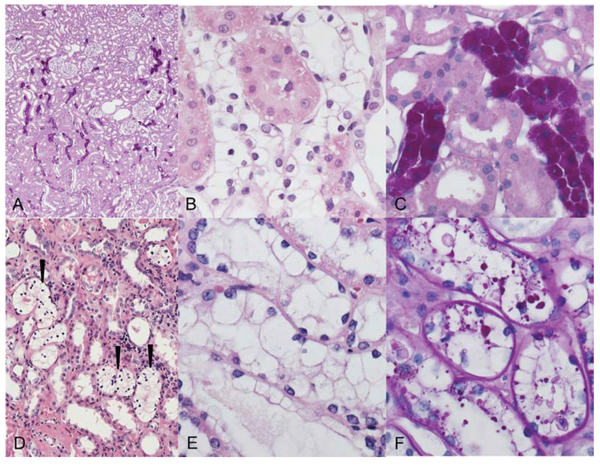 Figure 1: Clear cell tubules (CCT, A–C) of streptozotocin-induced diabetic rats and human glycogenotic alterations of distal tubules (D–F). A. Periodic acid-Schiff (PAS) reaction: distribution of PAS-positive rat AEL near the transition zone of renal cortex (upper part) and medulla (bottom). B. The cytoplasm of AEL cells is enlarged and appears clearly in hematoxylin and eosin (H & E) staining C. Magnification of PAS stain demonstrates the corresponding dense glycogen storage in distal AEL tubules. D, E. Human glycogenotic tubules (arrowheads) in a nephrectomy specimen. The similarity to rat CCT is easily recognizable in magnified H&E staining F. Glycogen is fast eluted in not perfused renal tissue, thus PAS staining is often patchy but still illustrates increased glycogen storage in enlarged tubules. Length of the lower edge A 1.25 mm, B, C, E, F 0.15 mm, D 0.5 mm.