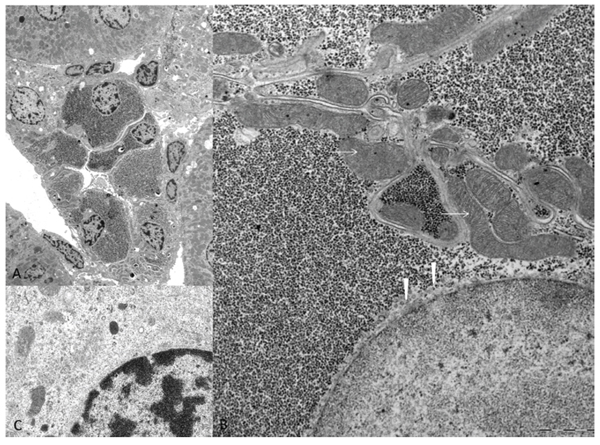 Figure 2: Electron microscopic features of diabetes related clear cell tubules (CCT). The overview micrograph A. illustrates a transverse section of an altered CCT with enlarged epithelium due to densely packed α-particles of glycogen in the cytoplasm B. in comparison to unaltered distal tubule epithelium C. with small amounts of glycogen and preserved loose distributed cell organelles. In CCT, masses of glycogen displace mitochondria (arrows) to the outer cell borders and the endoplasmatic reticulum (arrowheads) has nearly vanished and is only detectable beneath the nucleus. Length of the lower edge A 50 µm, B 7.5 µm, C 3 µm.