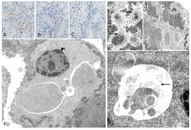 Figure 3: Autophagic activity in rat clear cell tubulus lesions. Immunohistochemical demonstration of microtubule associated light chain 3 A (LC3A) indicates autophagy activity in glycogenotic tubules of diabetic rats, without A. or after treatment with NVP/BEZ235 for 4 weeks B. Low autophagy activity was detected in control kidney samples of non diabetic rats following NVP/BEZ235 administration for 4 weeks C. Electron microscopic examination reveals segregation vacuoles in the cytoplasm of the distal tubular epithelium with membrane bound vacuoles (D. arrows), containing glycogen particles, thus representing autophagic vacuoles. In untreated diabetic rats E. they are small and often singular (segmentated square). After treatment with NVP/BEZ235 for 4 weeks F., G. vacuoles are multiple, large, filled with abundant amounts of glycogen and are membrane bound (arrow). Length of the lower edge: A-C 0.15 mm; D 1.5 µm, E 20 µm, F 17 µm, G 7 µm.