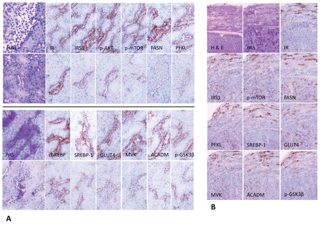 Figure 4: Representative immunohistochemistry in serial cryostat sections series of clear cell tubules (CCT) from streptozotocin-induced diabetic rats (A) and preneoplastic tubular lesions and renal carcinomas in rats after administration of N-Nitrosomorpholine (NNM) (B). A. CCT of diabetic rats after 4 weeks (upper panel of each row) with clear cell feature in H&E staining, which is caused by glycogen storage, as shown by strong positivity to the PAS reaction. Overexpression of the insulin receptor (IR) leads to upregulation of activated/phosphorylated AKT and mTOR proteins. Glucose accumulation is due to upregulation of glucose transporters, i.e. GLUT4, a process dependent on insulin. Utilization of glucose in the glycolytic pathway (PFKL) is facilitated by activated/phosphorylated AKT and chREBP. Glycogenolysis is inhibited, as GSK-3β is phosphorylated/ inactivated. Additionally, SREBP-1 mediates transcription of enzymes of de novo lipogenesis (MVK, FASN). Simultaneously, β-oxidation of fatty acids is activated, as acyl-CoA dehydrogenase for acyl chains of medium length (ACADM) is upregulated. CCT of rats treated with NVP/BEZ235 for 1 week (lower panel of each row) are small and narrowed and reveal lower expression of all members of the PI3K/AKT/mTOR pathway examined. B. Molecular and metabolic alterations in NNM-induced glycogenotic preneoplastic tubules (upper part of each picture) and solid renal cell carcinomas (lower part) are similar to those detected in diabetes-induced nephrocarcinogenesis (24 months old rat, NNM was administered as a single dose). Length of the lower edge: 4A H&E, PAS 0.25 mm; immunohistochemistry 0.125 mm; 4B 0.3 mm.