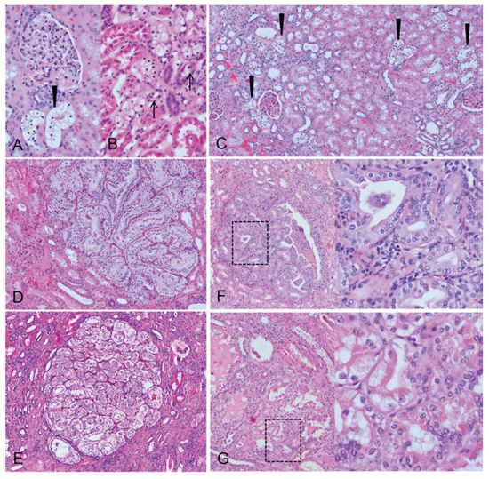 Figure 5: Morphological aspects of human clear cell tubules (CCT) and advanced lesions. Glycogenotic CCT (A. arrowhead) at the related glomerulus with its vas afferens and the transition (B. arrows) of distal tubule epithelial cells to glycogen storing CCT and multiple CCT lesions in the renal cortex (C. arrowheads) could be detected in the nephrectomy specimens. The glycogenotic tubules also form cell clusters near the related glomerulus D. or almost 1 mm large nodules. Nodular lesions with a basophilic (E. larger magnification of the square box) or acidophilic (F. larger magnification of the square box) cytoplasm, enlargement of nuclei and prominent nucleoli represent advanced lesions. Length of the lower edge: A, B 0.3 mm, C 1.67, D, E 1 mm, F, G 0.6 mm.