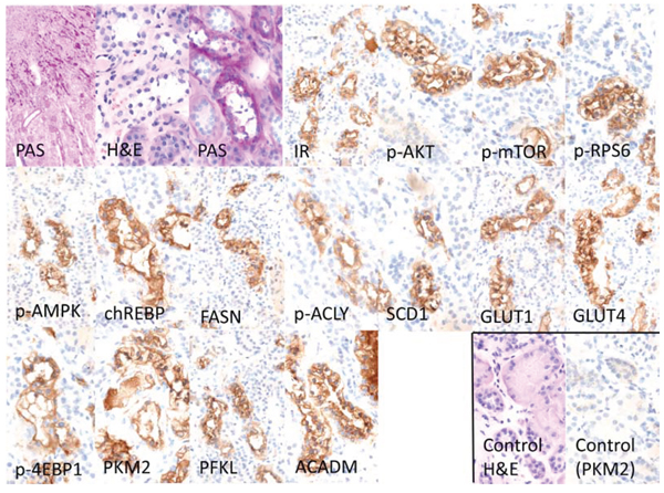 Figure 6: Representative immunohistochemical findings in serial cryostat sections series of human glycogenotic tubules. At low magnification and PAS reaction, human glycogenotic distal tubules can be easily detected in the transition zone of renal cortex and medulla. Their cytoplasm is swollen and appears “empty”, containing glycogen, as it can be demonstrated with purple staining in PAS-reaction. The insulin receptor (IR) and members of the PI3K/AKT/mTOR signaling pathway (phosphorylated AKT and mTOR, RPS6, and 4EBP1) are induced when compared with adjacent renal tissue (control H&E and representative negative immunohistochemistry staining). Activation of the IR increases glucose uptake via translocation to the cell membrane of GLUT1 and 4. Also, glycolysis (PKM2, PFKL), de novo lipogenesis (phosphorylated/inactivated AMPK, FASN, ACLY, SCD1 and chREBP) and β-oxidation of lipids (ACADM) are strongly induced in glycogenotic tubules. There is no expression of any of the investigated proteins in proximal or unaltered distal tubules of the same kidney (control), as shown by representative immunohistochemistry for PKM2. Length of the lower edge: PAS overview 0.4 mm; remaining stainings 0.14 mm.