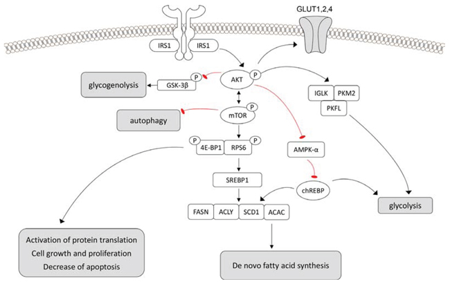 We show that the PI3K/AKT/mTOR cascade and related metabolic changes, including increased glycolysis, glycogen synthesis, and de novo lipogenesis, are induced in the very early stages of nephrocarcinogenesis in the rat and in human glycogenotic tubules. These peculiar metabolic alterations (Figure 7) resemble the Warburg effect in many cancer entities [25], and are also documented in human and rat preneoplastic glycogenotic foci of the liver [21, 22]. The same metabolic and molecular alterations occur in advanced stages of human ccRCC [1]. In particular, the PI3K/AKT/mTOR cascade is recurrently activated in ccRCC and strongly associated with ccRCC progression [26, 27]. Moreover, in diabetic nephropathy, there is an early activation of mTOR signaling leading to hypertrophy, proliferation and apoptosis in cells of the mesangium and proximal tubular cells [4].