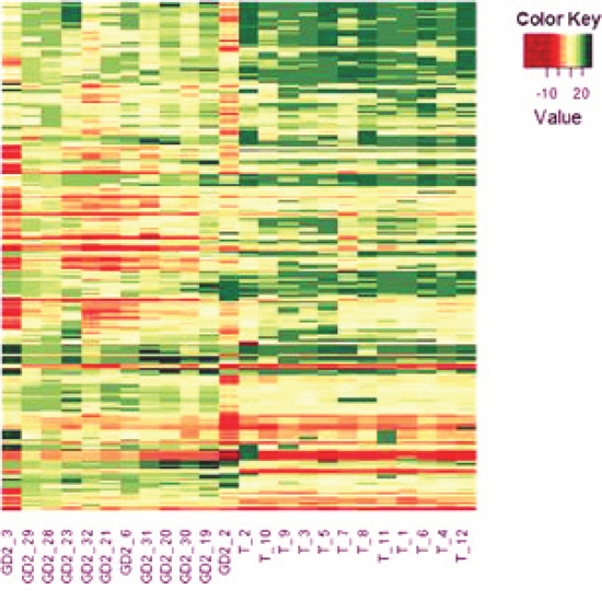 Twenty-two BM-infiltrating GD2+ cell samples were immune-selected at diagnosis, as previously described [8]. Simultaneously, 22 frozen primary tumor specimens, containing more than 80% NB cells, were selected from our bio-bank to possibly match the demographic, biological and clinical characteristics of the BM-infiltrating samples. All samples belonged to stage M [2] NB patients aged more than 12 months at diagnosis. Each group of samples was then randomly divided. Twelve BM-infiltrating NB cells and twelve primary tumors were used to determine the complete miRNA profiling and identify the miRNAs whose expression was significantly different between primary tumors and metastases.