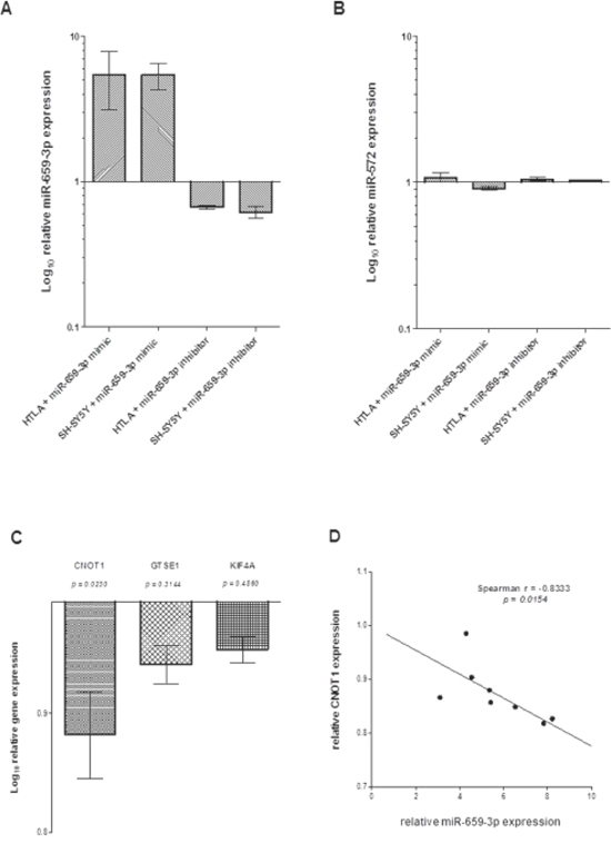 As shown in Figure 2C, RT-qPCR analysis confirmed that CNOT1 expression was specifically and significantly modified by miR-659-3p mimic and inhibitor treatment, whereas GTSE1 and KIF4A expression was not affected by the treatment. Moreover, in NB cell lines treated with miR-659-3p mimic and inhibitor, CNOT1 expression levels inversely correlated to miR-659-3p expression levels (Figure 2D). Taken together, these findings demonstrated that CNOT1 expression in NB cells was specifically modified by miR-659-3p.