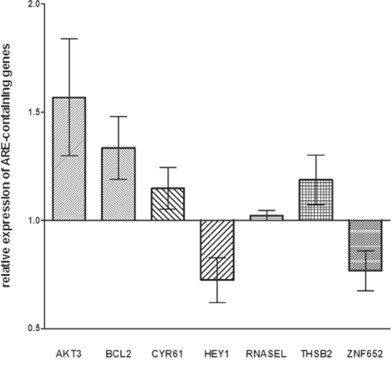 Figure 3: Expression levels of genes containing ARE-sequence in HTLA-230 and SH-SY5Y cells treated with miR-659-3p mimic and inhibitor. Results of RT-qPCR analysis from two independent experiments are reported as Log10 of relative expression respect to that occurring in cells treated with irrelevant miRNA mimic and inhibitor. Standard errors are indicated. All p values were not significant. The RT-qPCR data were normalized using HPRT1 as reference gene.
