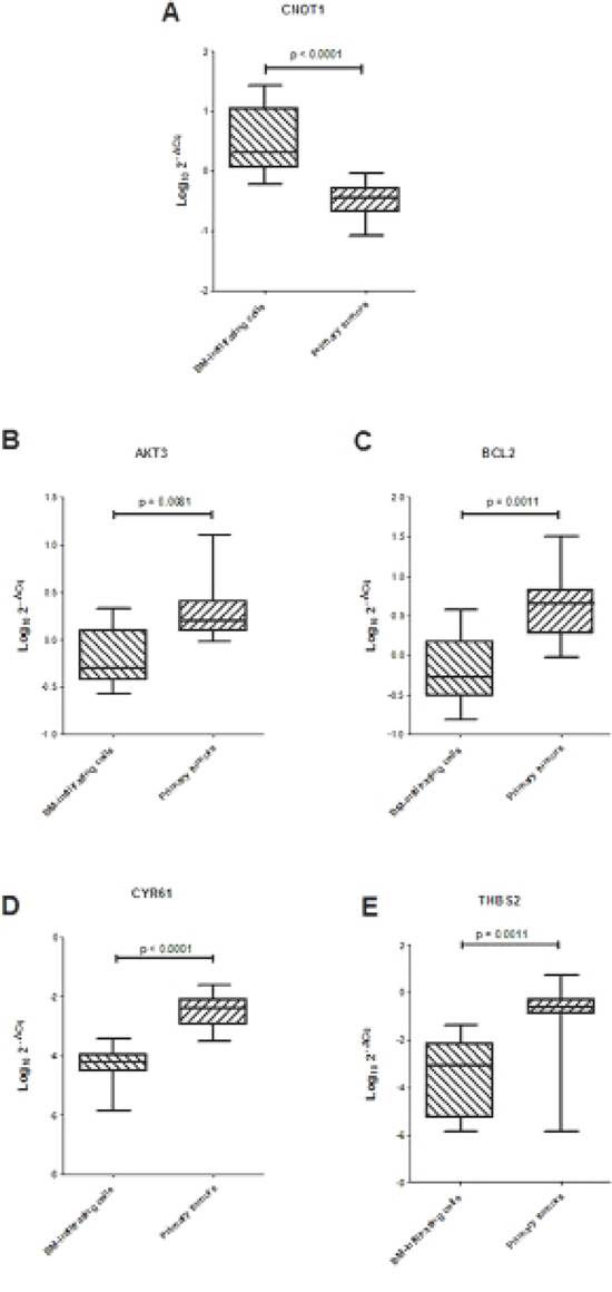 Figure 4: (A) Expression levels of CNOT1 and (B–E) ARE-sequence containing genes involved in focal adhesion pathway in 10 BM-infiltrating and 10 primary tumors. Data are expressed as Log10 2−ΔCq values, were ΔCq is the difference between the Cq for the target gene and the Cq for the reference HPRT1 gene. Horizontal bars in the box-plots indicate medians. P values are indicated.